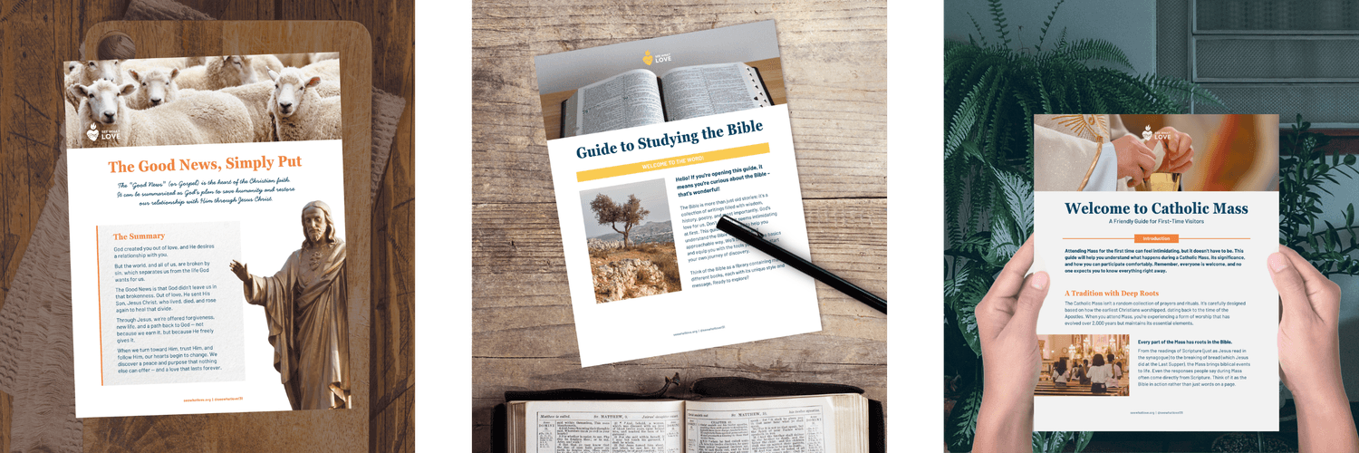 While we work on developing a great website experience for you, we're offering FREE PDF RESOURCES to help you learn about the Good News, how to study the Bible, and what you need to know for attending Mass!